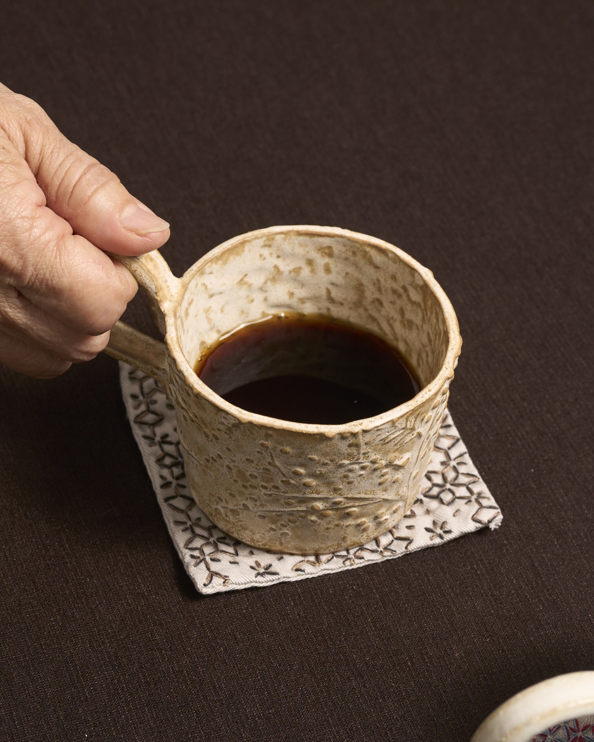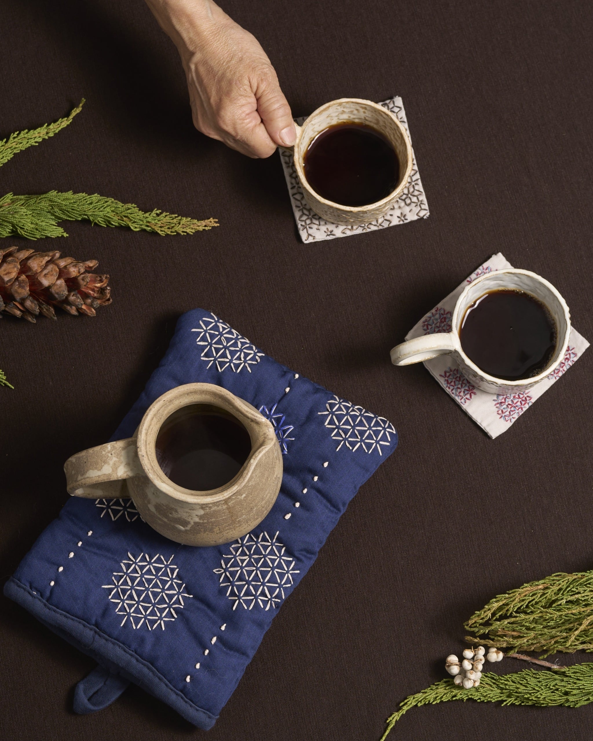 シンプルなグラスやマグを、美しい刺し子の上にのせれば、楽しいお茶の時間の始まりです。