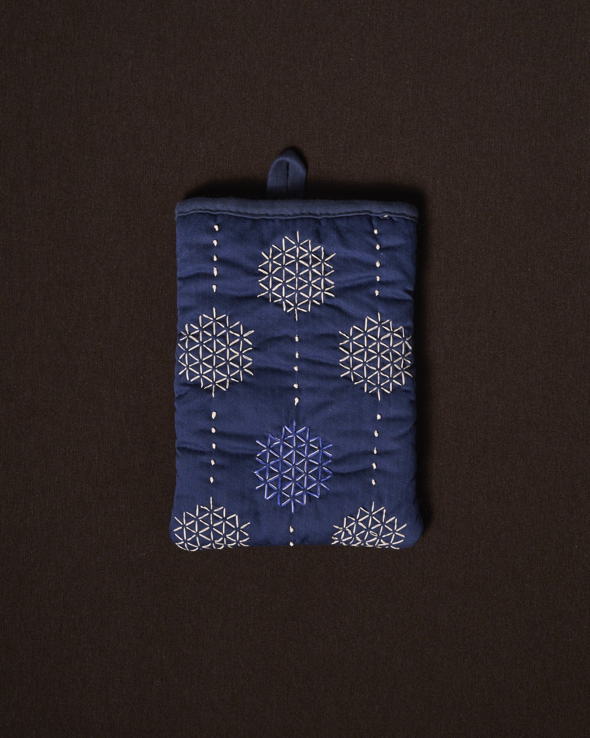 コットンツイルのネイビーブルーの表地と、ブルーグレーの裏地、雪の結晶のような模様で刺し子を施しました。